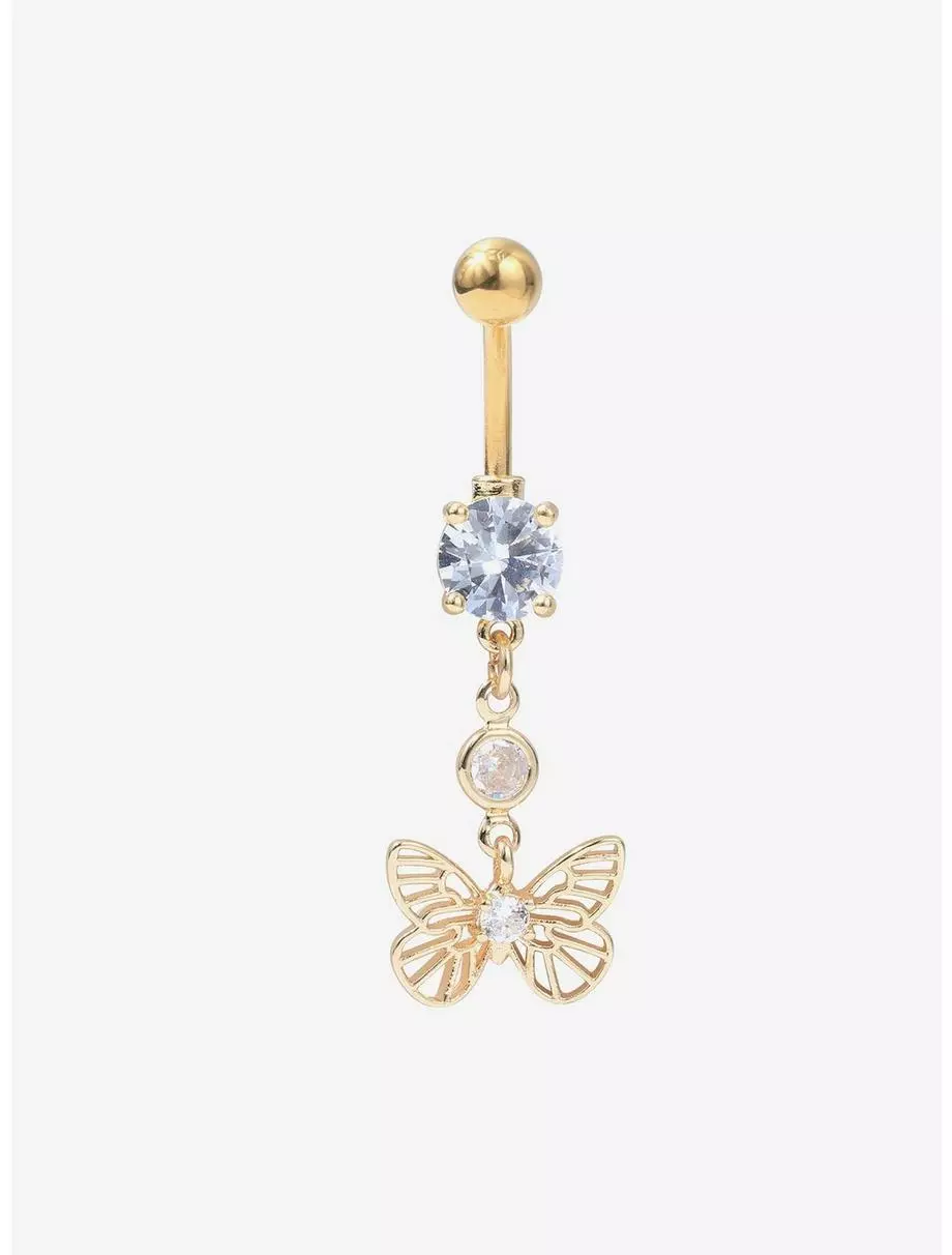 Gold-tone navel barbell with butterfly charm and CZ accents.
