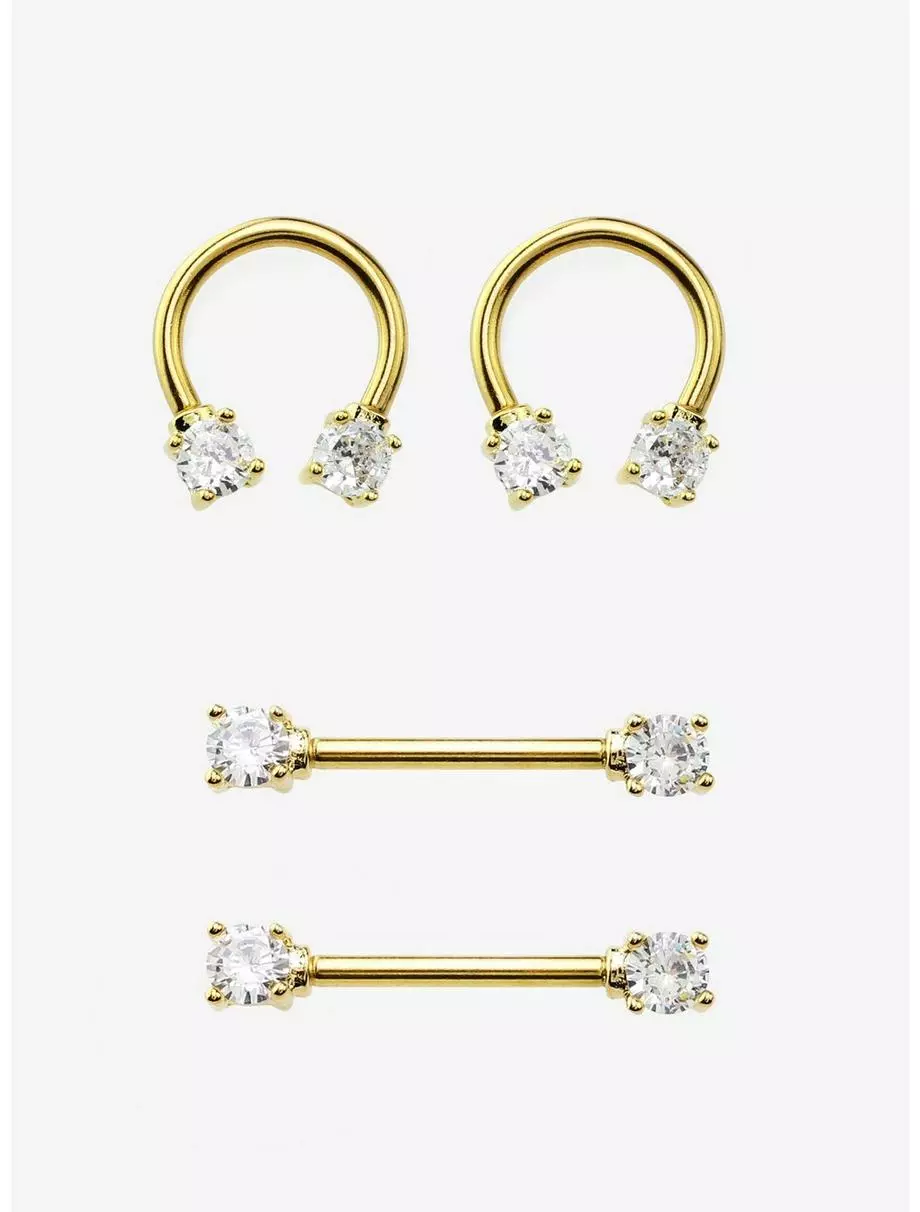 Set includes two pairs of gold-tone nipple barbells with clear gem detailing.
