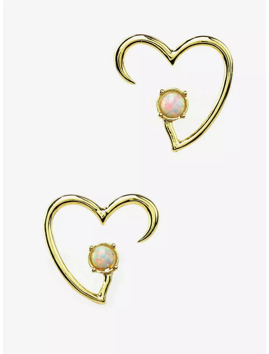 A pair of gold-tone captive hoops featuring a heart shape and opalescent gem accent.