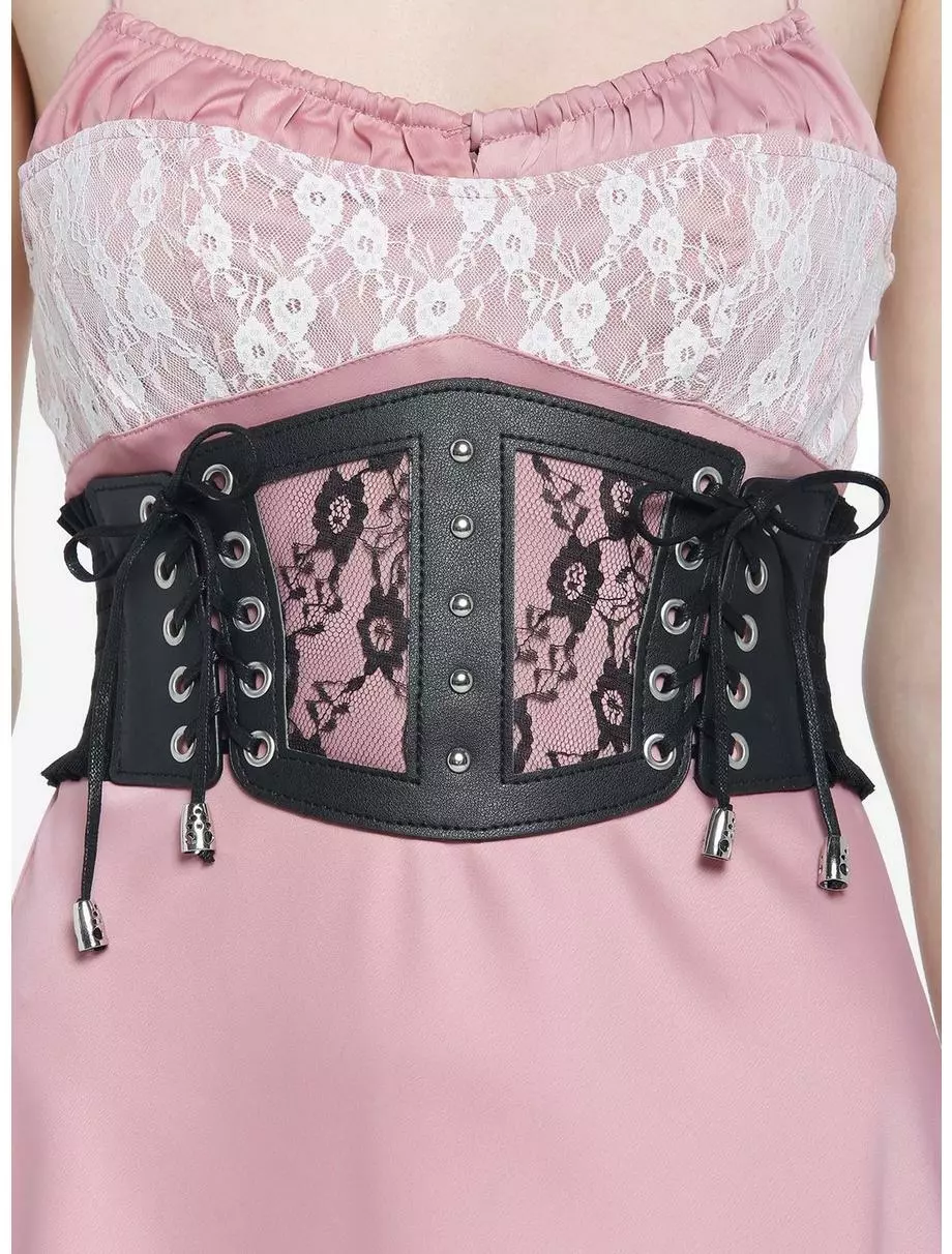 Take your OOTD to a spicy level with this black corset, featuring lace-up detailing on the front and floral lace panels. Complete with a ruffled elasticated back and triple snap-button closure.