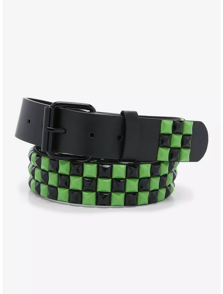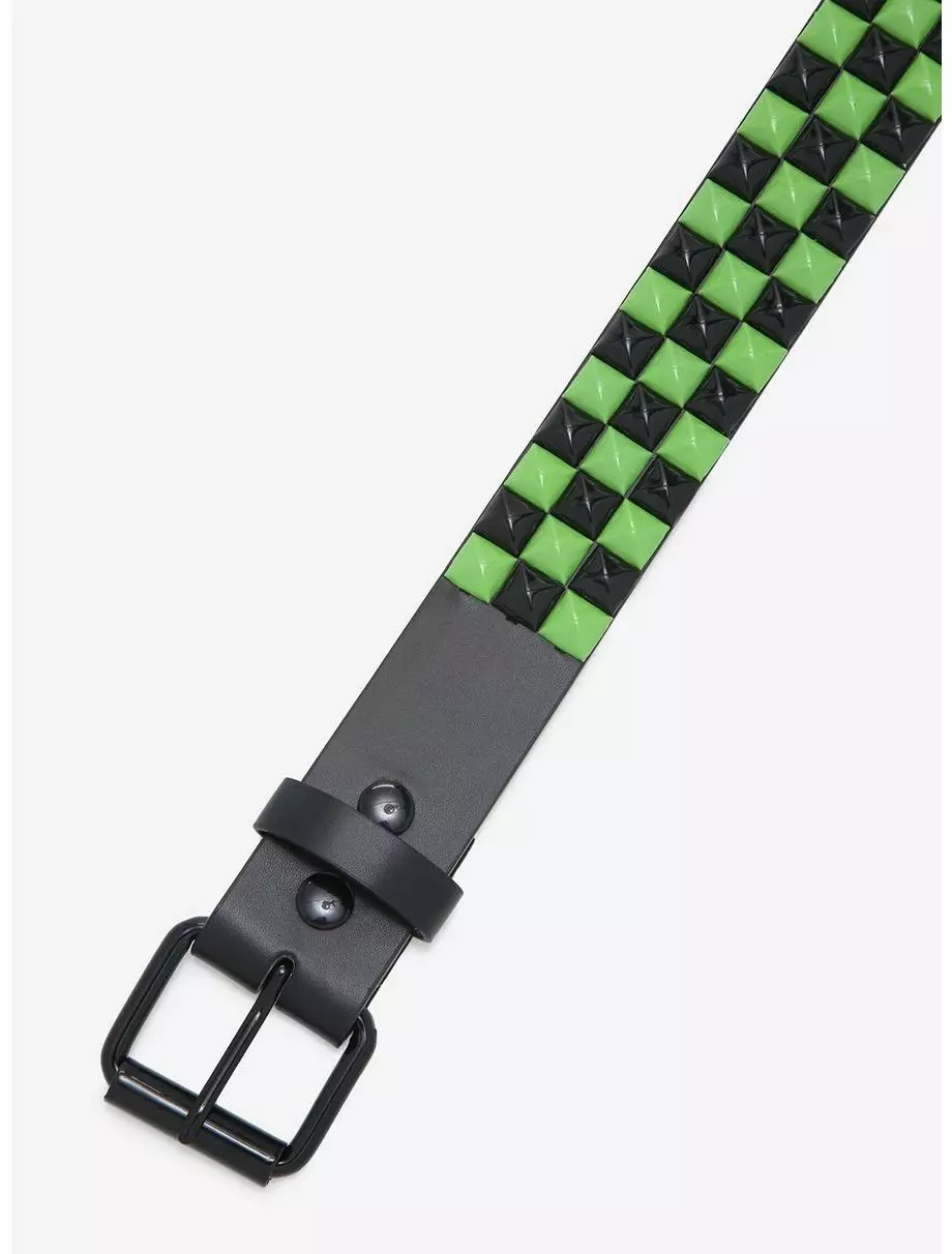 Take that classic studded belt look one notch further with this black and bright green version. Features black hardware.