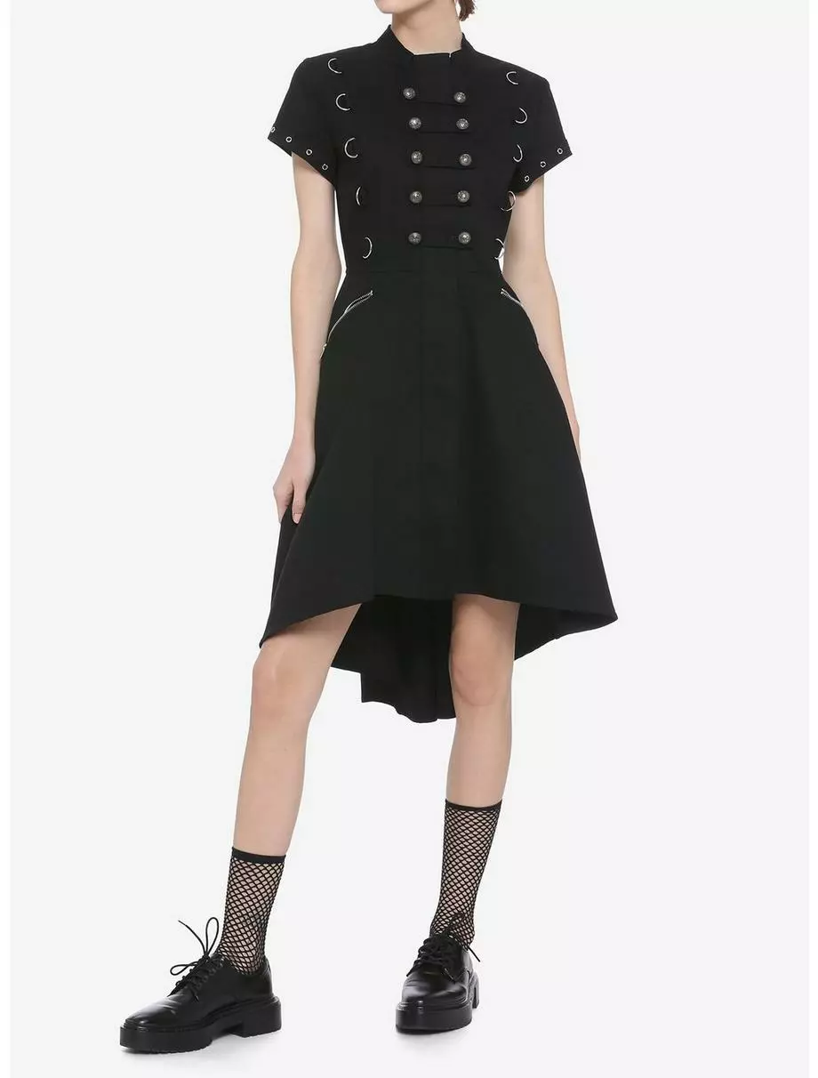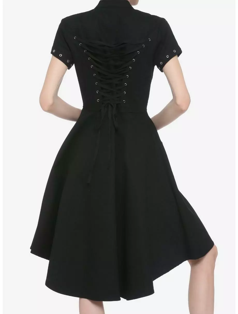 Feel like your dresses need a bit more hardware? We get it. This black short-sleeved dress should have enough! Featuring a front zipper closure with functional dome buttons and straps across the chest, decorative D-rings, grommets on the sleeve trim, zipper hip pockets and a functional back lace-up detail. What more could you ask for!