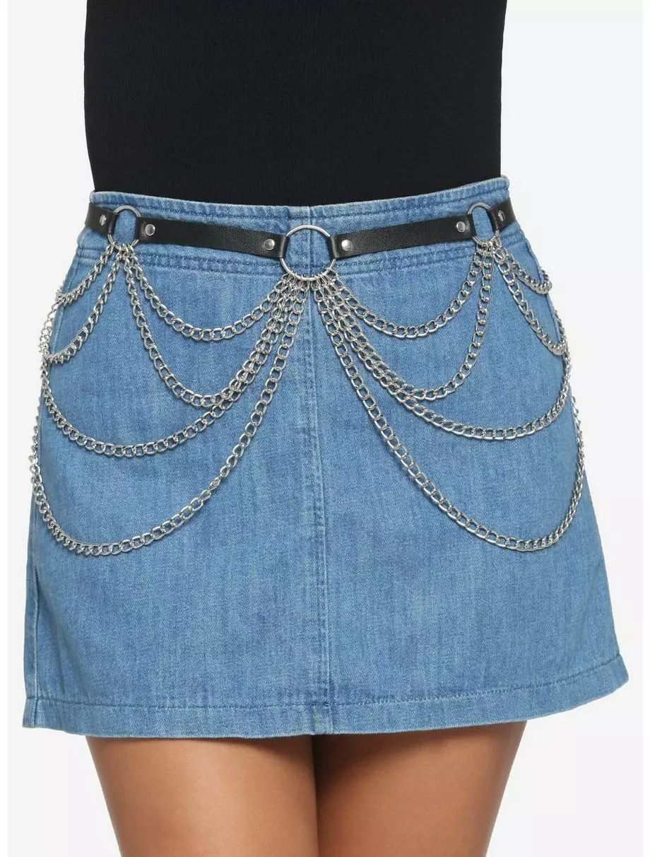 Add some statement to your look with more chains! This black faux leather belt features two O-rings with grommet details, and multiple chains draping across the front and sides.