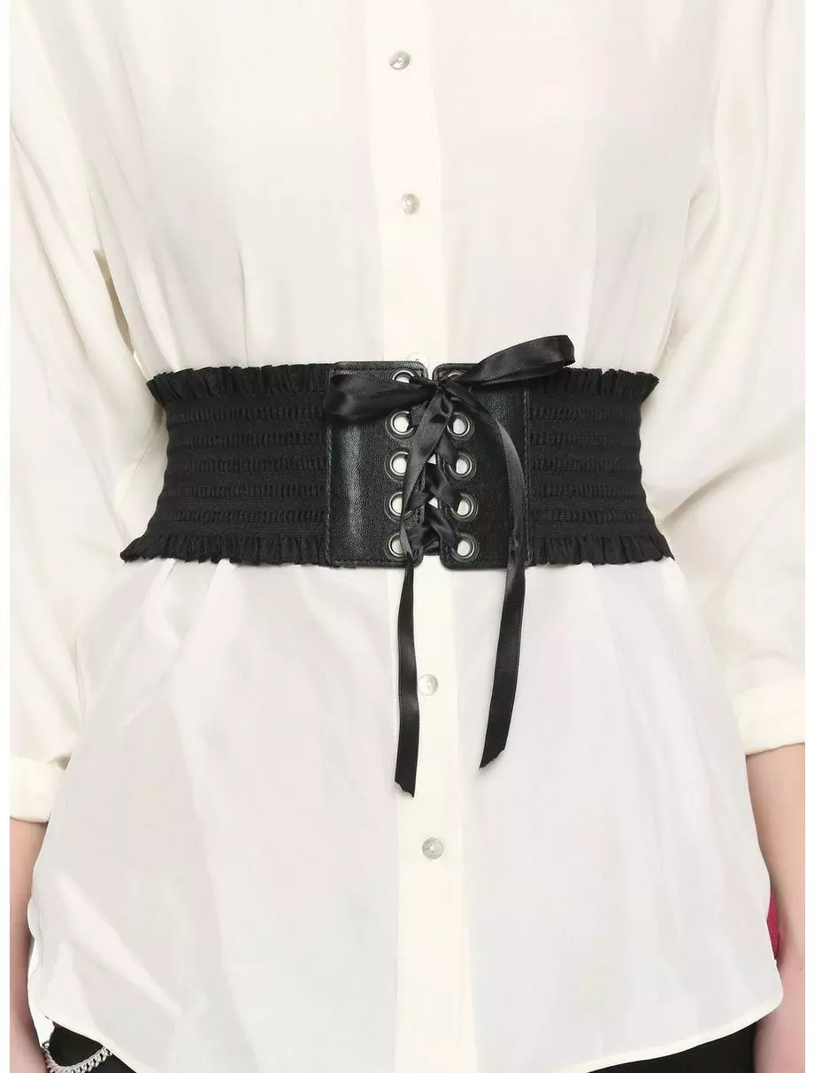Finish off your look with this black corset featuring an elastic strap, ruffle trim and lace-up closure.