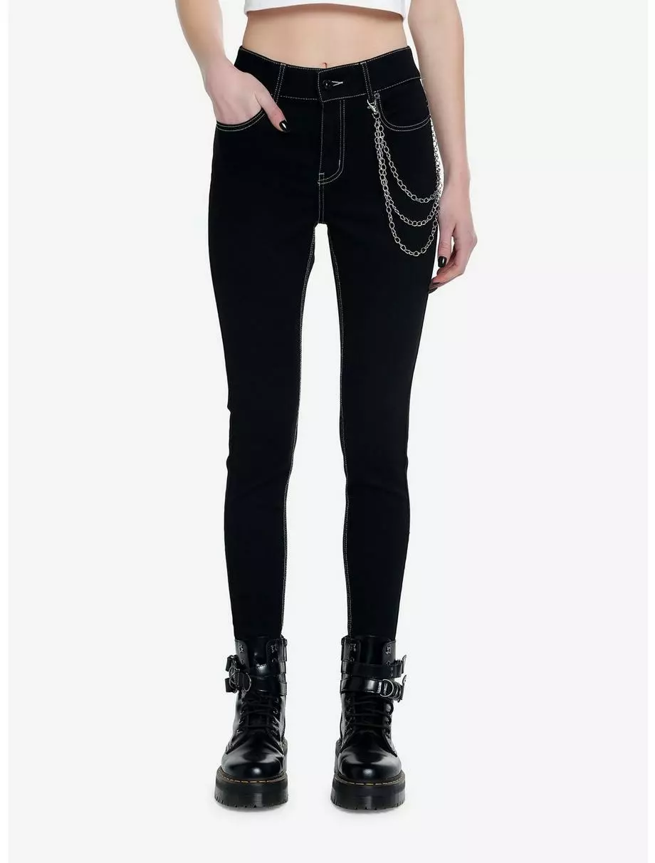 We’ve found your wardrobe staple. Keep it classic in a pair of skinny jeans! This black pair has a super skinny fit and features white contrast stitching throughout. Comes with a removable triple side chain and classic 5-pocket styling.
