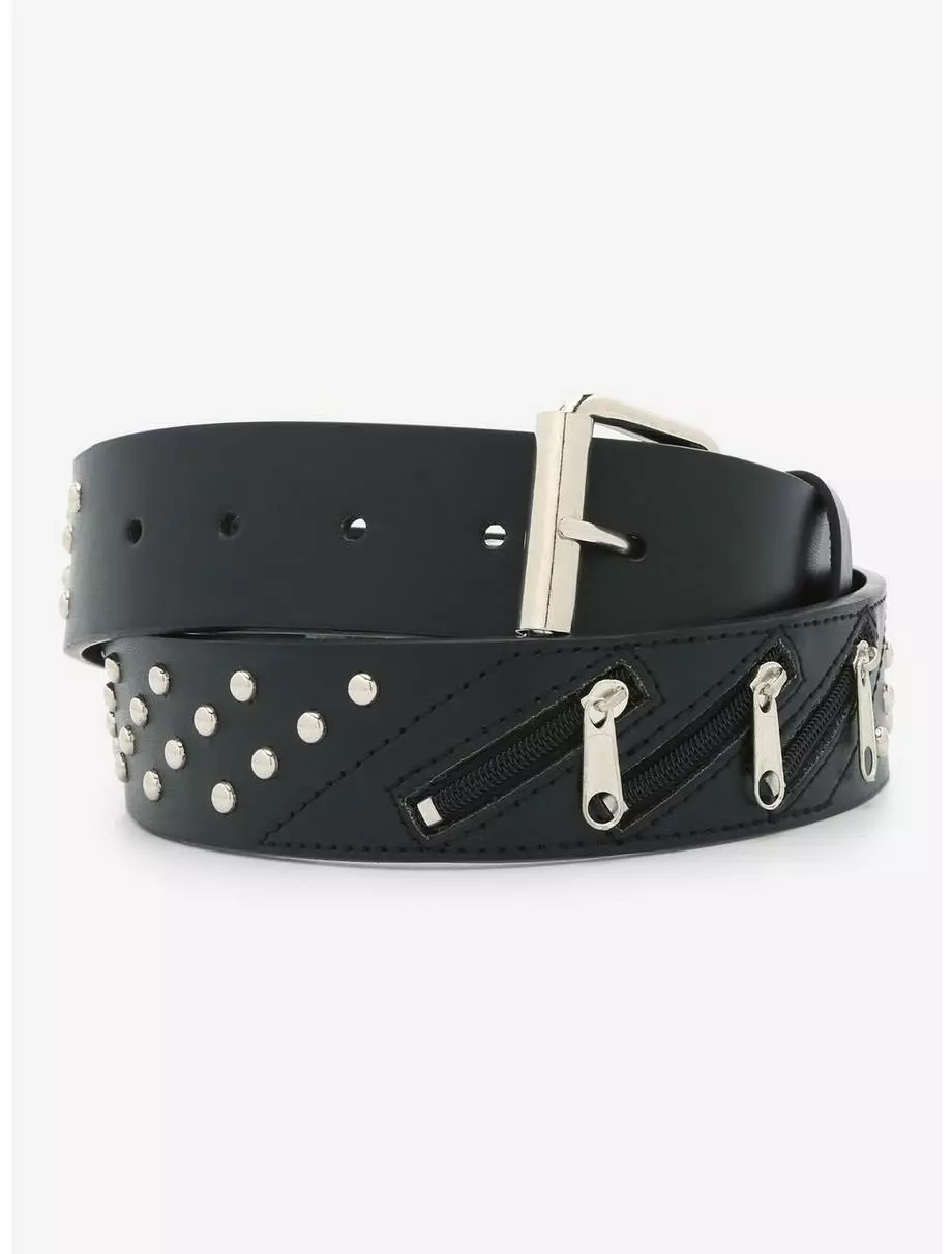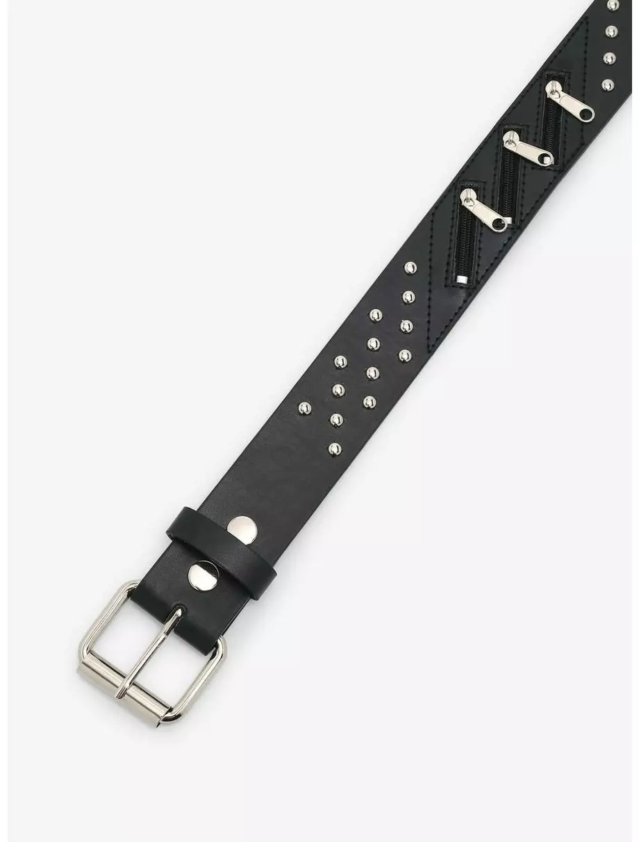 Elevate your belt game with more hardware! This black, faux leather belt features zipper and silver-tone stud detailing.