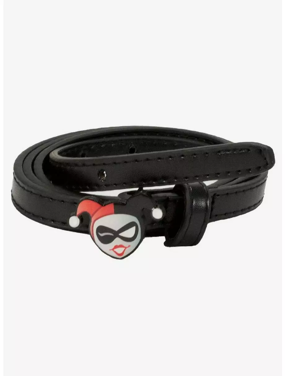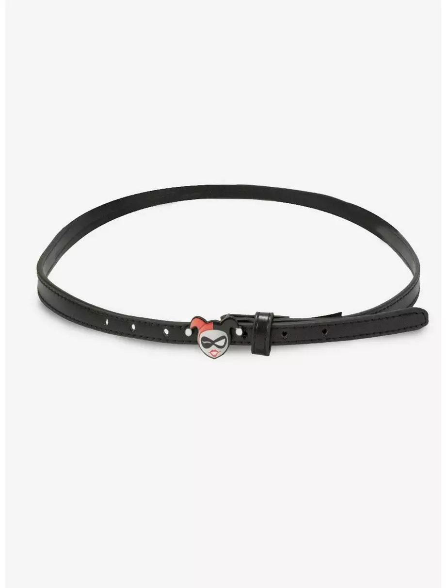 This DC Comics belt is made from vegan leather and features Harley Quinn’s winking expression. This belt is 0.5 inches wide and adjusts to fit 34 to 40 Inches. This belt does fit through pant loops.