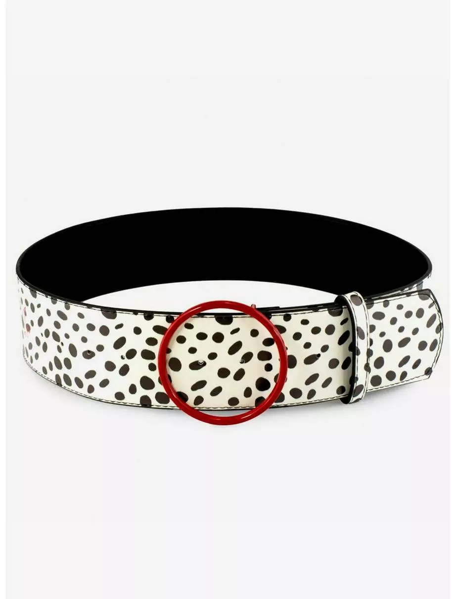 This Disney belt is made from vegan leather and features Cruella De Vils Dalamatian Spots. This belt is 2.5 inches wide and adjusts to fit 41 to 49 Inches. Does not fit through pant loops.