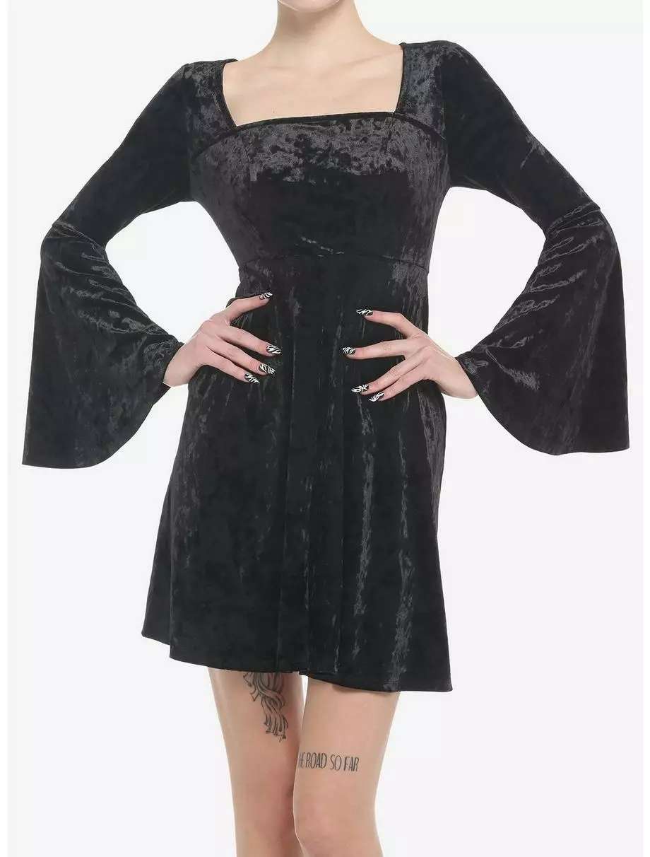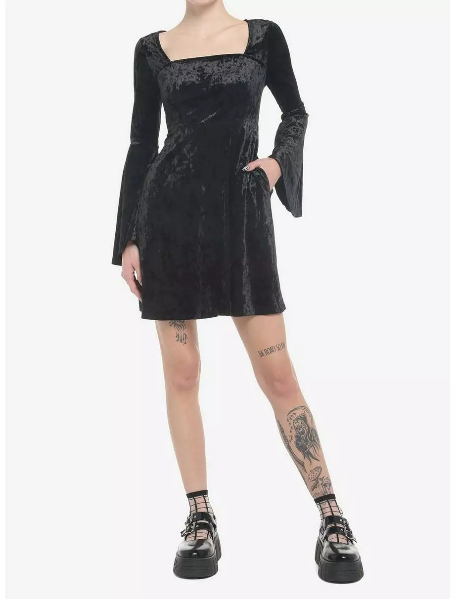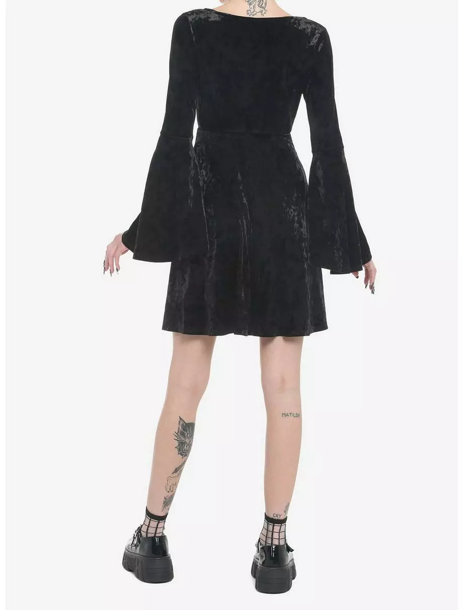 Black Crushed Velvet Bell Sleeve Mini Dress