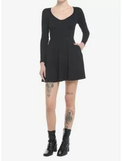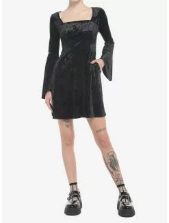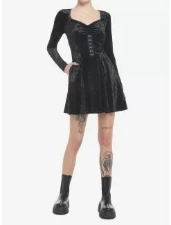 Need a witchy basic in your wardrobe? This hooded dress has lace trim on the sleeves and bottom hem, bell sleeves, and a lace-up neckline. There are also pockets.