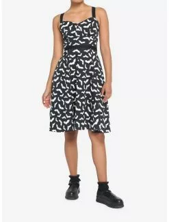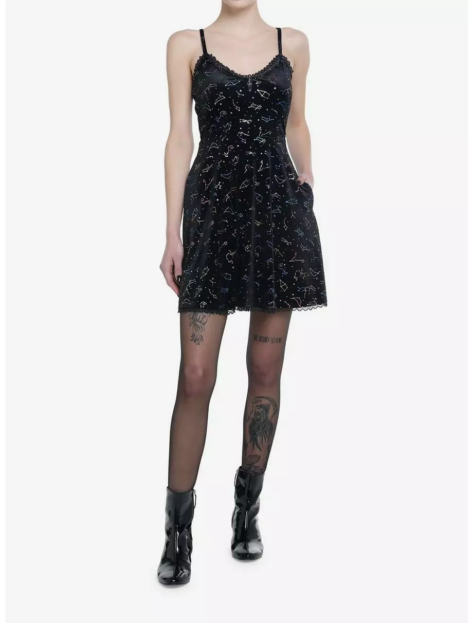 No need to look to the stars for your next statement-making piece. This velvet cami skater dress has a shiny allover print of iridescent rainbow constellations, plus lace details at the sweetheart neckline and skirt hem. Comes with a faux crystal at the center chest, adjustable straps and pockets.