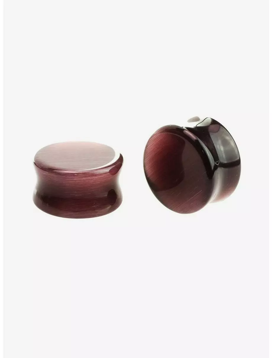 A pair of glass plugs in a burgundy shade and saddle shape.