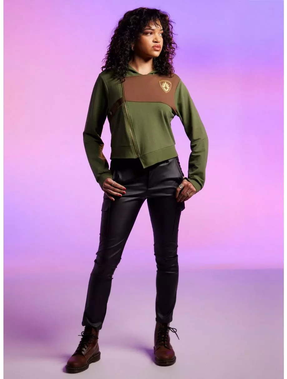 Once a Guardian, always a Guardian. Rep Gamora with this hoodie from Guardians of the Galaxy: Volume 3! It has an asymmetrical hem and features a moto zipper closure on the front. Comes with brown color blocking, the Guardians logo embroidered at the chest and buckle detailing on the side.