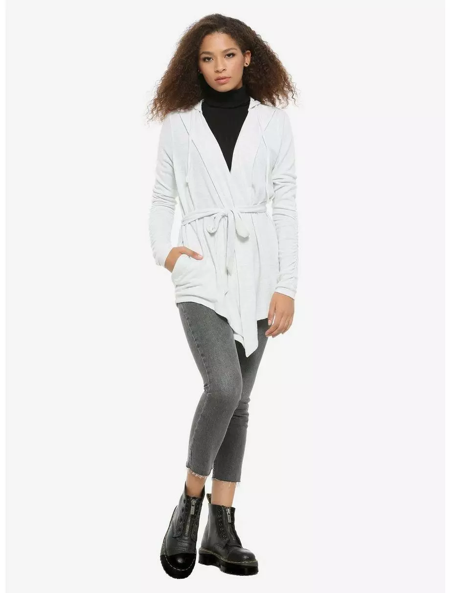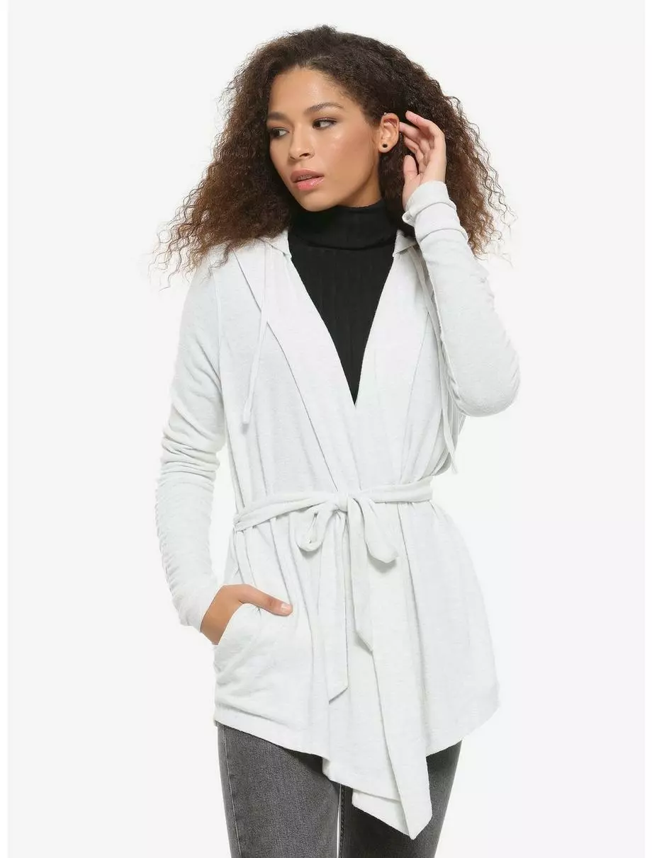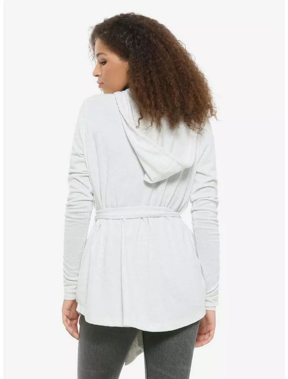 Feel like the scavenger-turned-Resistance-fighter, Rey, with this light grey cardigan from Star Wars: The Rise of Skywalker. The soft cardigan features a drawstring hood, tie belt closure, thumb holes in the sleeves and side pockets.