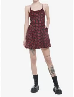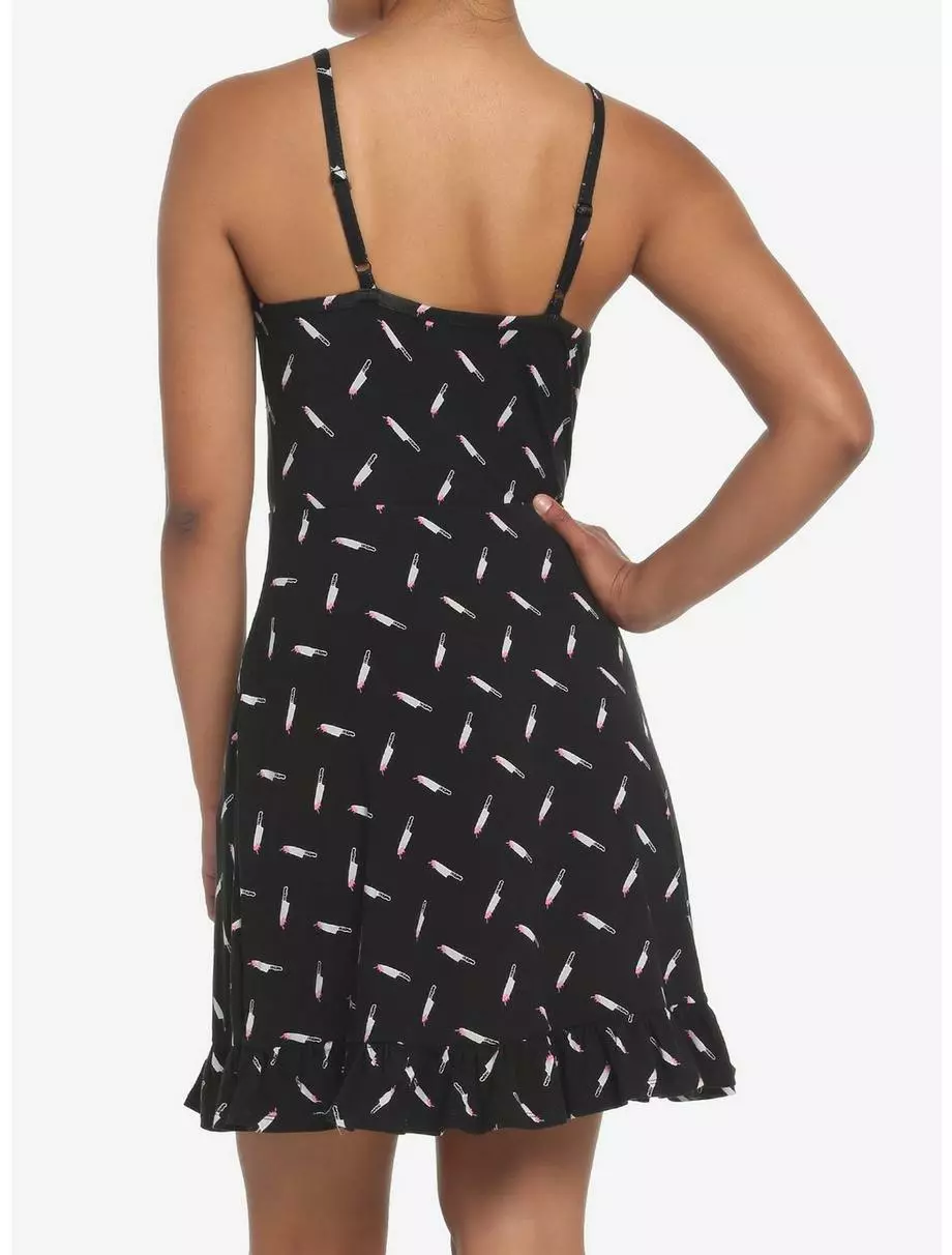 Look killer all summer long in this black dress featuring a bloody knife print all over, ruffle trim, pockets and adjustable straps.