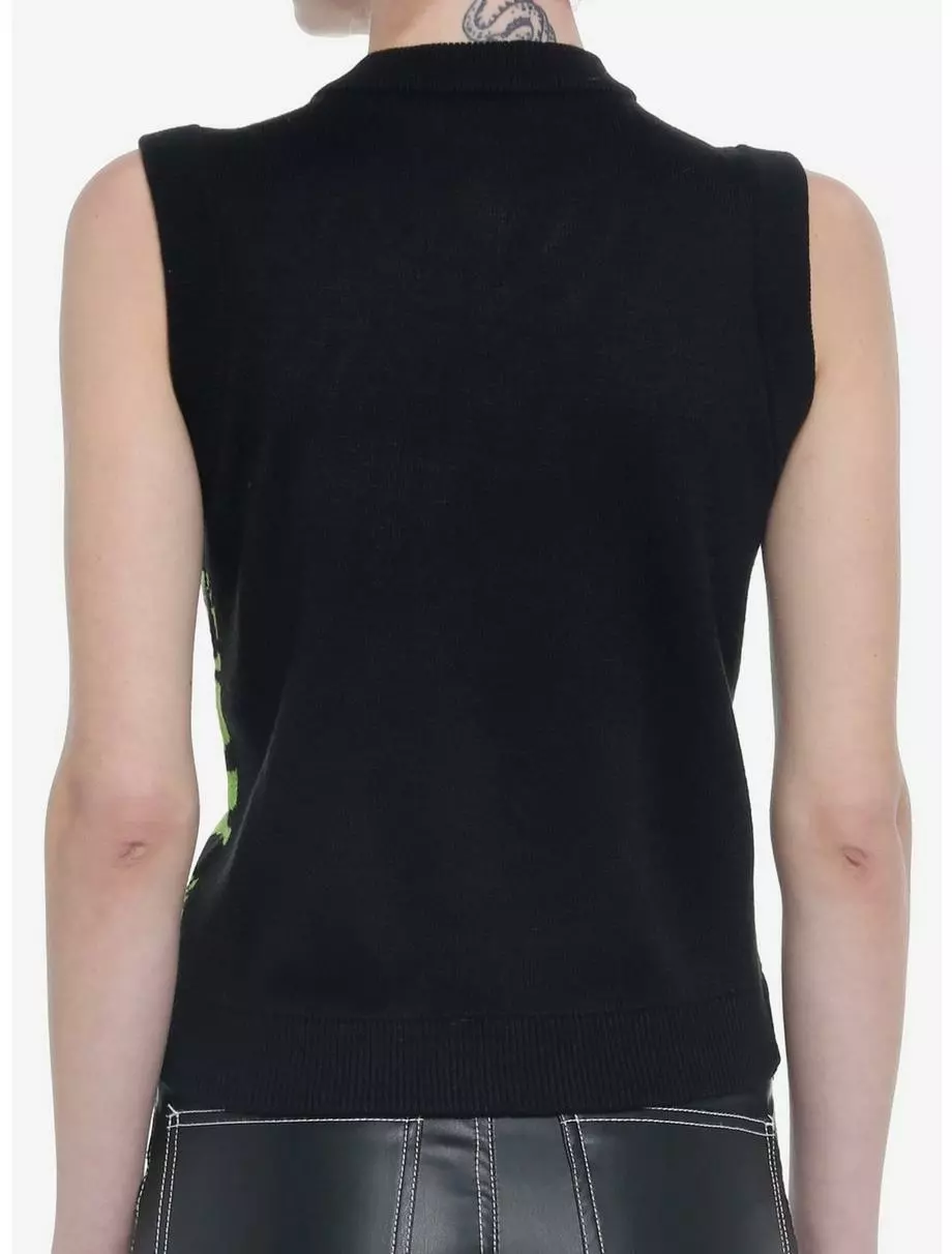 Something out of this world is ready to crash land into your closet! Channel those extraterrestrial vibes with this black and green sweater vest, featuring a checkered print depicting alien heads and mushrooms.