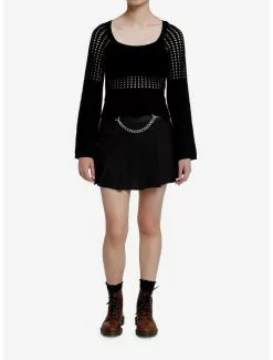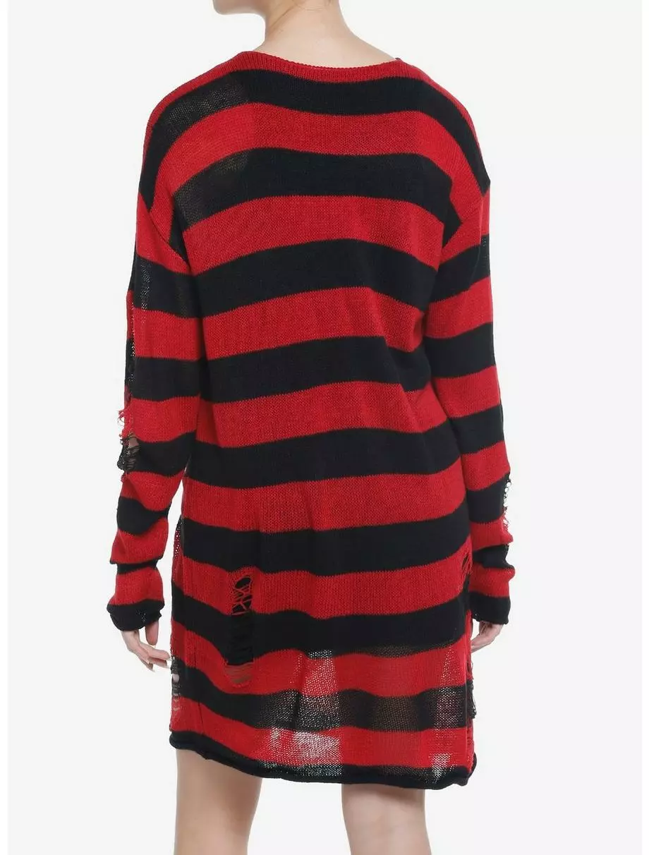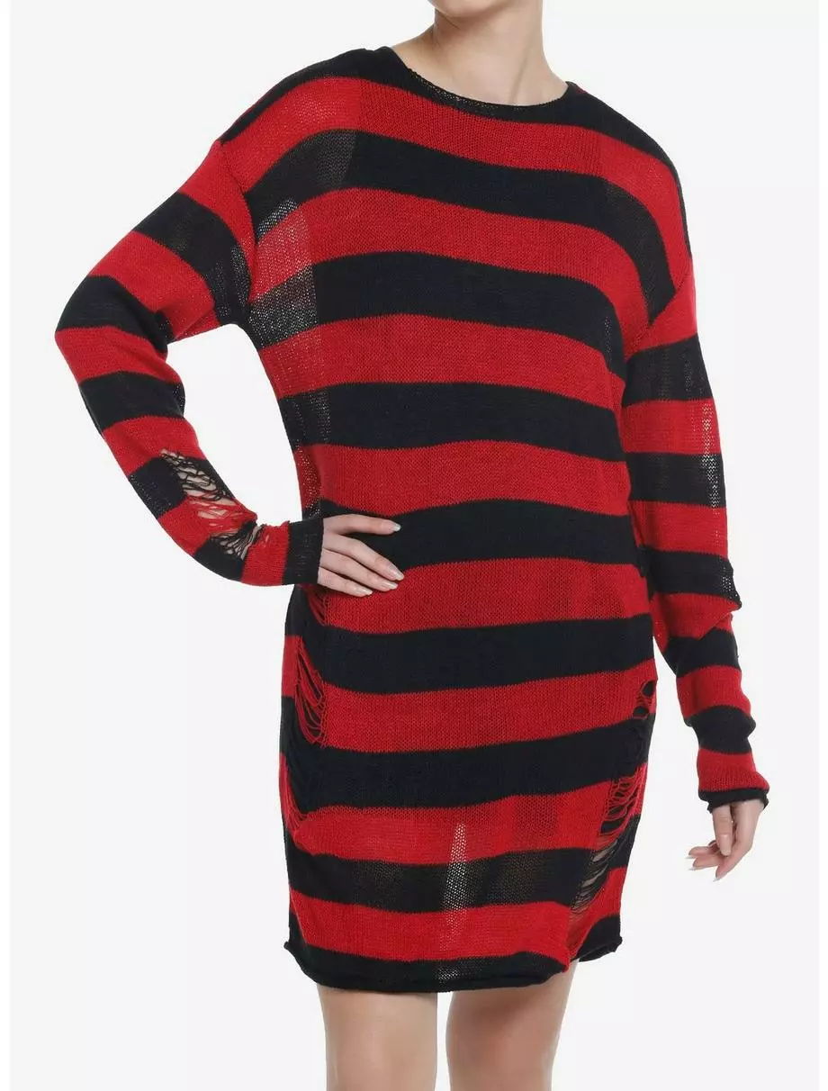 Keep it punk and cozy in this knitted sweater dress! It is slightly see through and features a classic black and red stripe design, plus distressed detailing on the sleeves and sides.