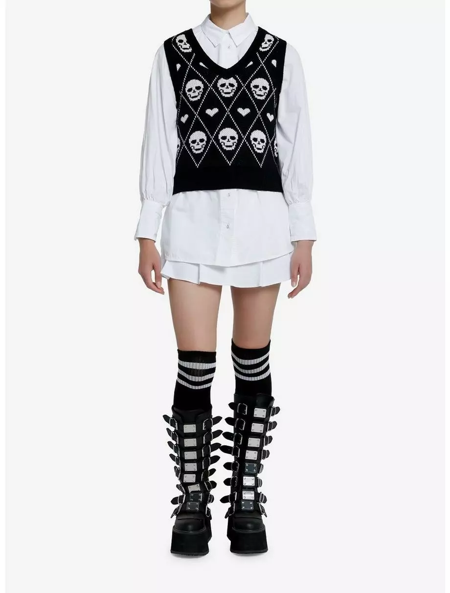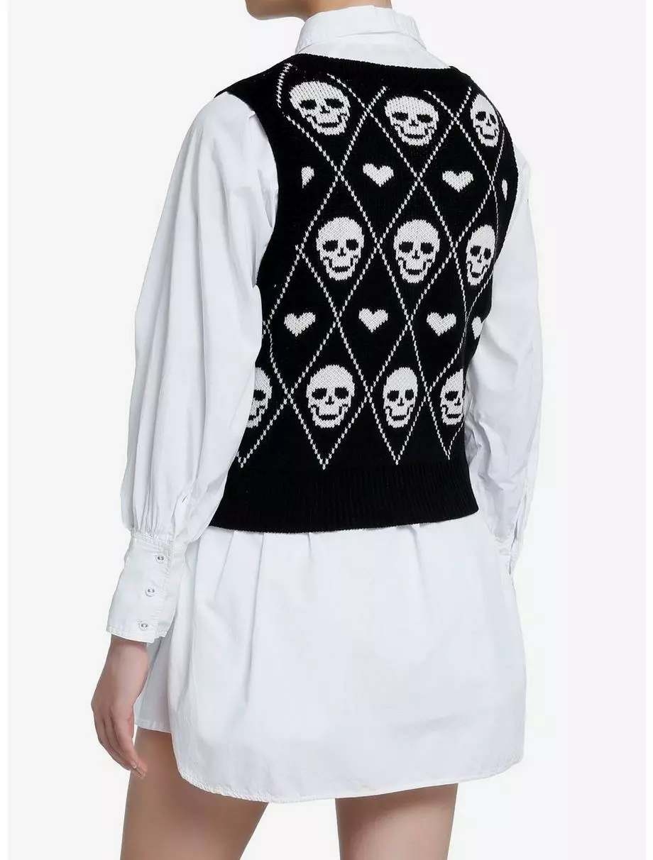 Break some hearts with this cute new sweater vest! Add some punk to your academia look with this knit sweater vest, featuring an argyle intarsia design with skulls and hearts all over.