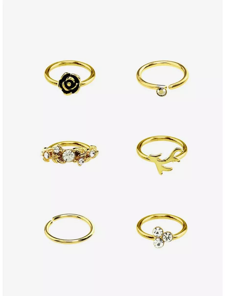 Set of 6 gold-tone nose hoops with rose, branch and gem detailing.