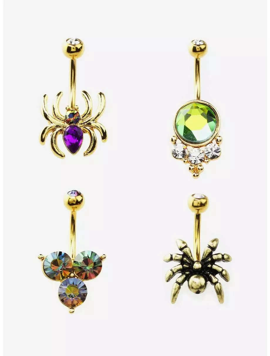 This set of navel barbells is ready to crawl into your body jewelry lineup! This gold-tone set comes with two spider pieces and two ornate gem pieces.