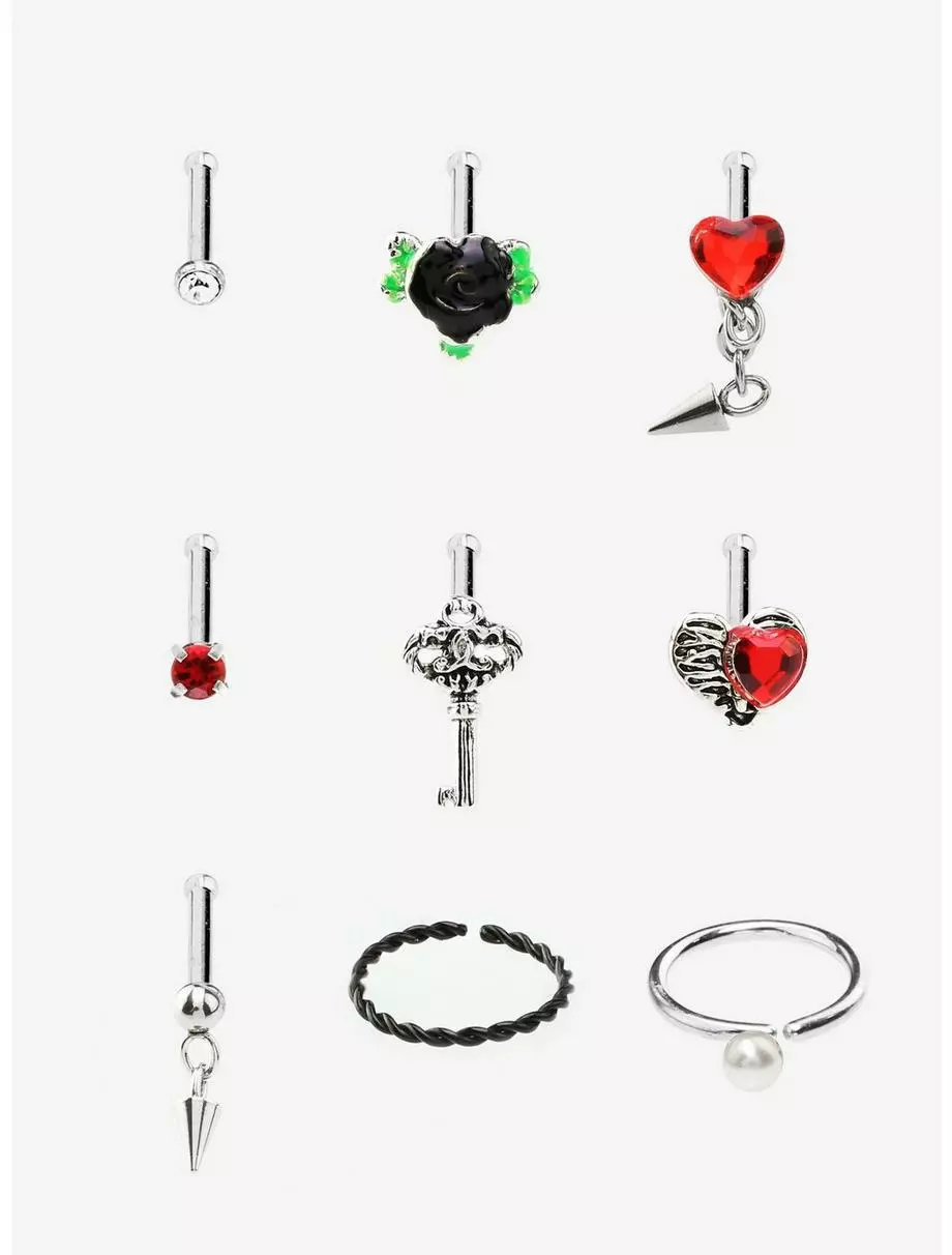 Steel Heart Rose Key Nose Stud & Hoop 9 Pack