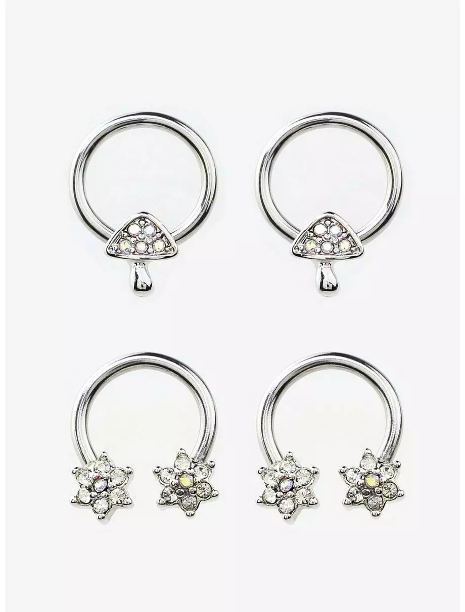 These super cute pieces are ready to make your body jewelry collection bloom! This set features silver-tone captive hoops and curved barbells with bejeweled mushrooms and flower ends, filled with CZ gems.