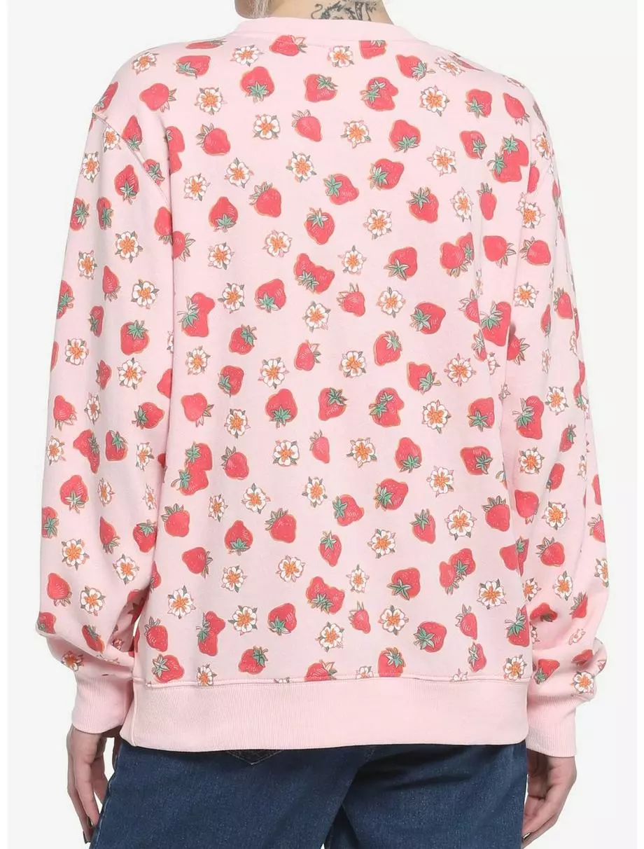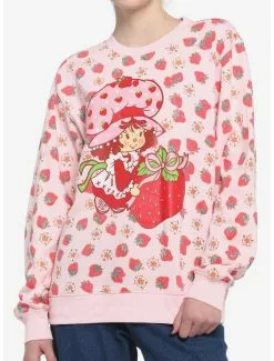 Look as sweet as Strawberry Shortcake with this sweatshirt on! Keep your wardrobe berry cute with this pink crewneck, featuring an allover toss of strawberries and flowers, and a jumbo print of Strawberry Shortcake in a vintage style on the front. Comes with pink ribbing at the cuffs and hem.