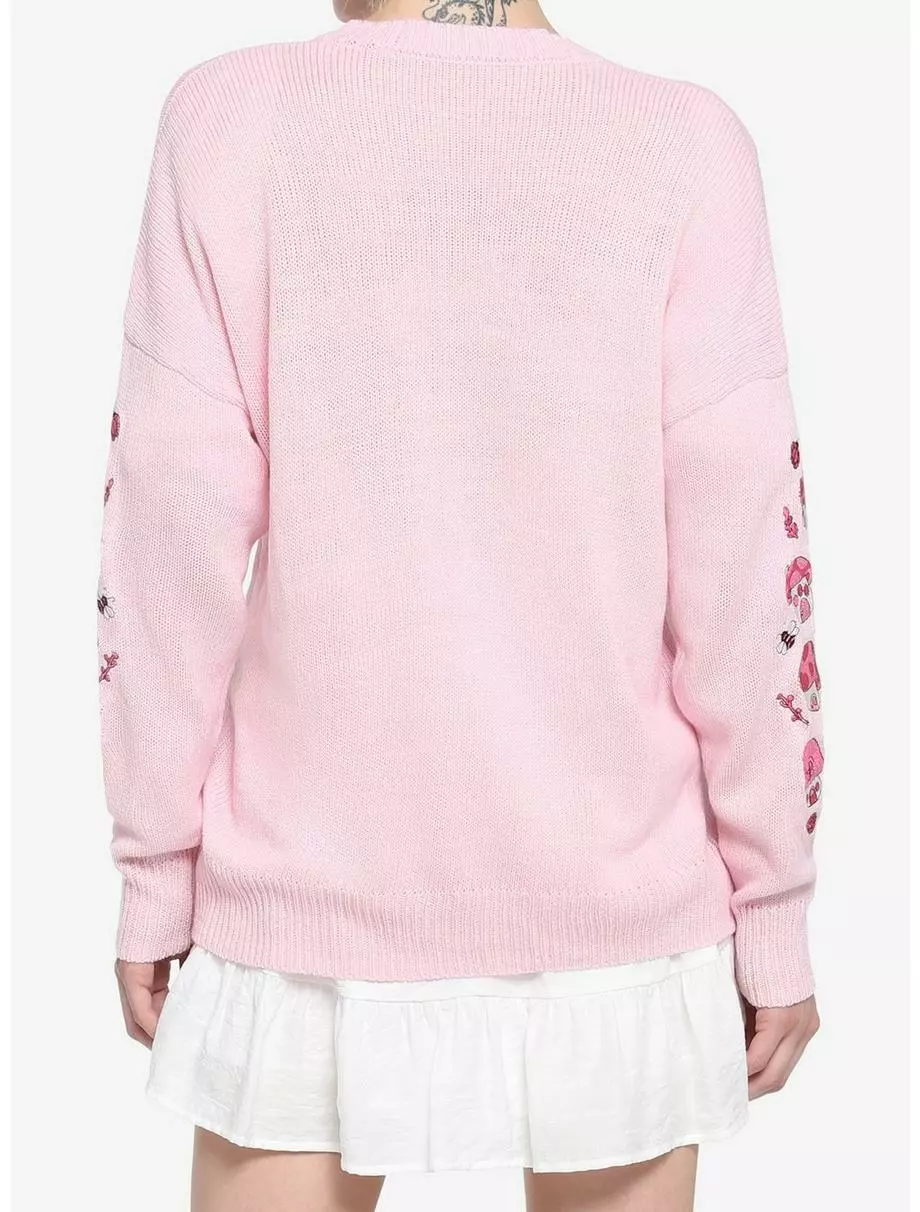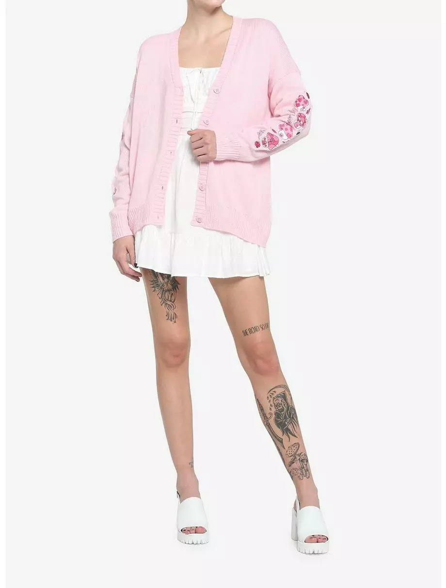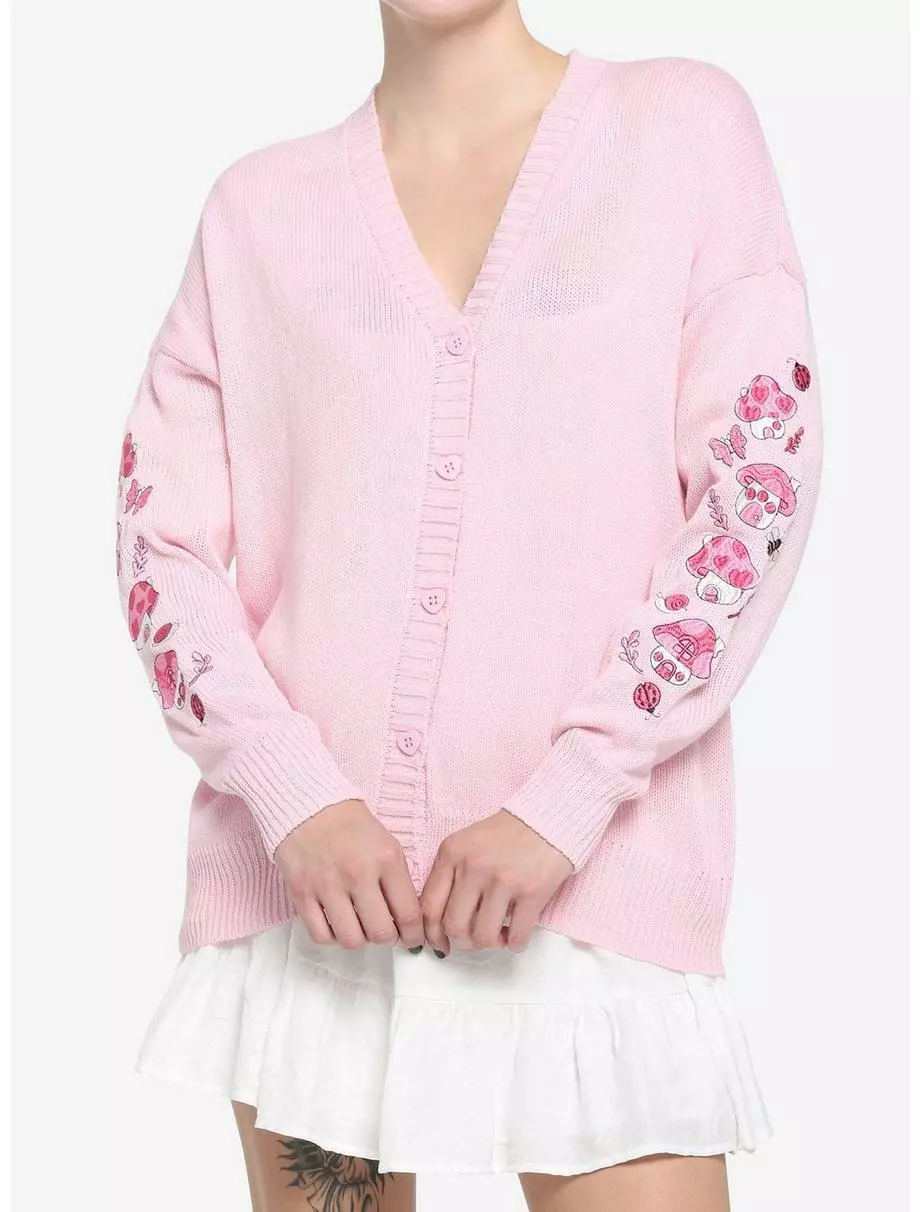 Loving the cottagecore aesthetic, but not a fan of neutrals? Then this pastel pink cardigan is just what you’ve been looking for! It features pink embroidered mushroom houses down the sleeves, plus forest critters and leaves. Complete with adorable, heart-shaped buttons down the front.