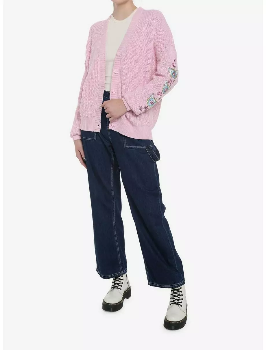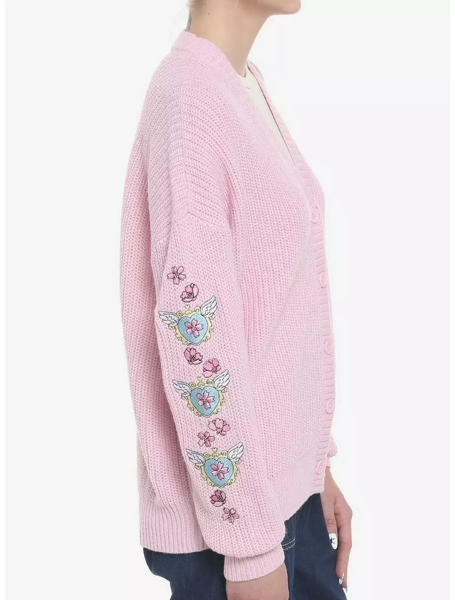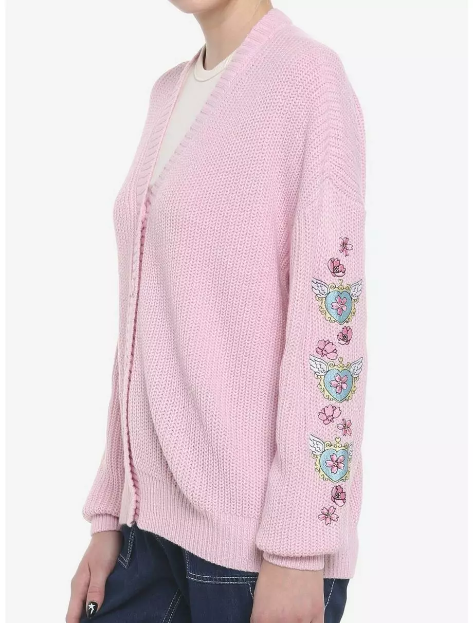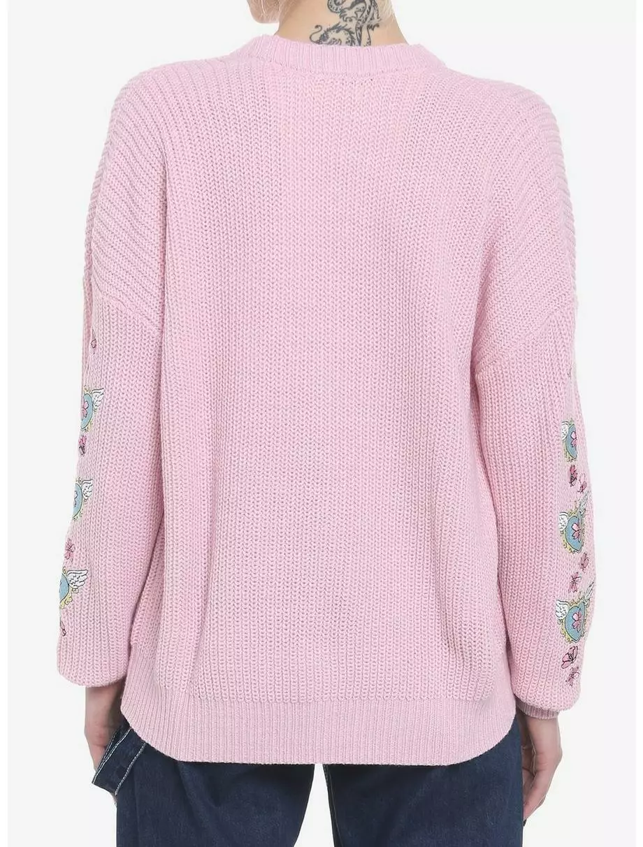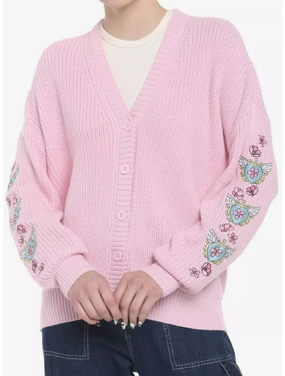 Kawaii-ify your outerwear look with this pastel pink cardi. It has an oversized fit and has sleeves decorated with embroidered sakura blossoms and hearts with angel wings.