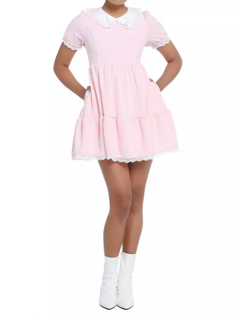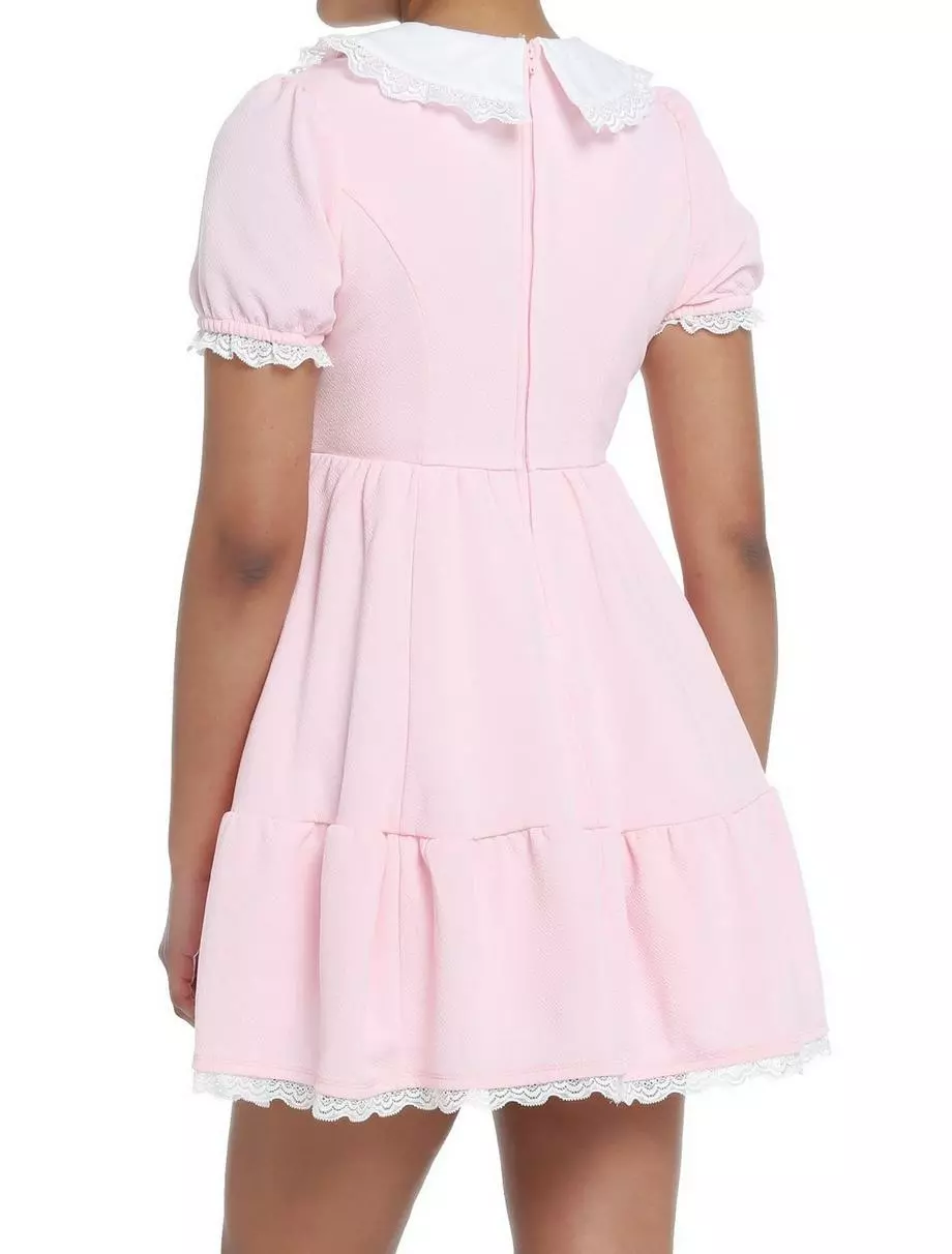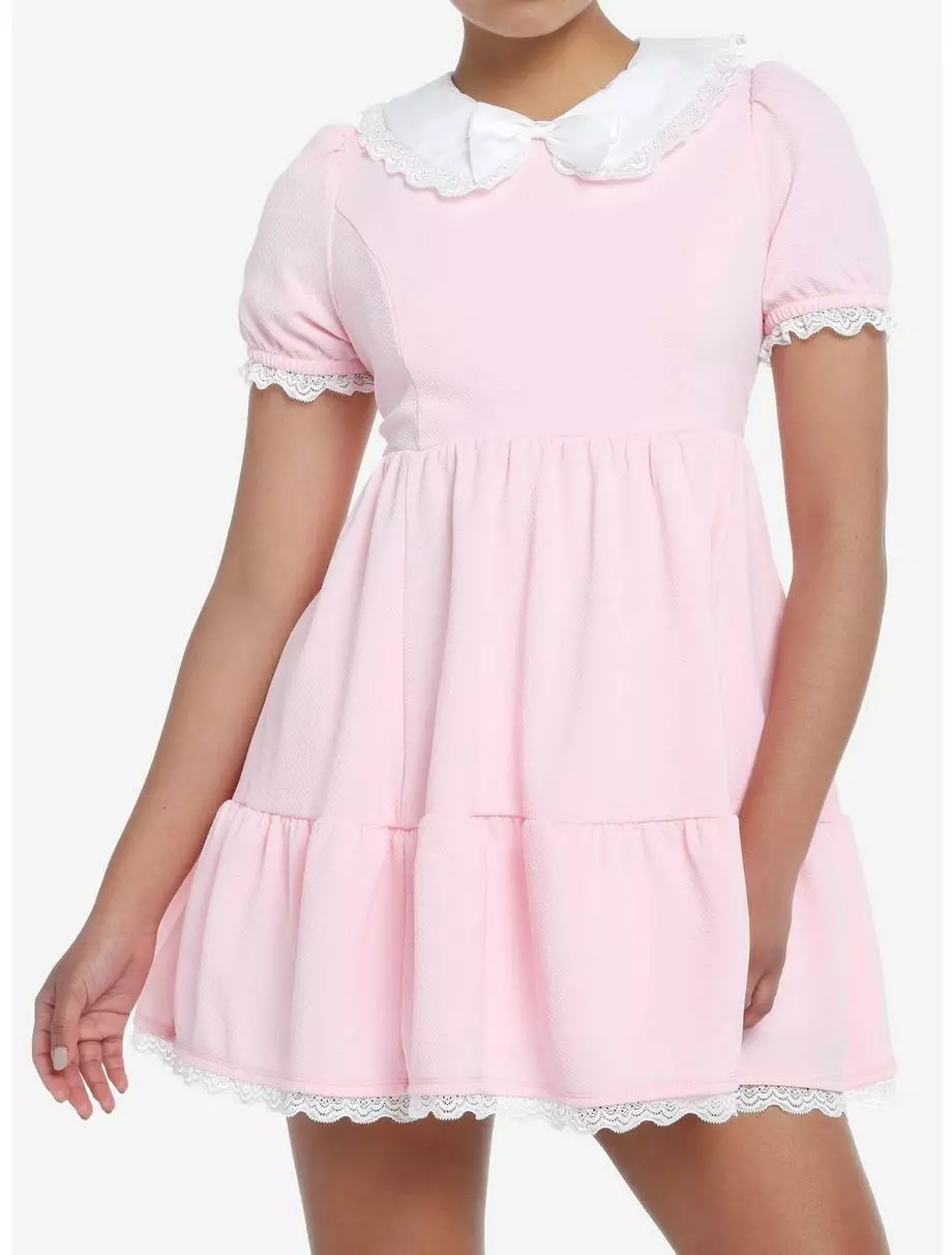 Got somewhere special to go? Look pretty in pink in this supercute dress! This dress features a lined tiered skirt with delicate white lace trimming. Comes with puff sleeves with more trimming and a white peter pan collar with a dainty bow accent. Complete with a back zipper closure and side seam pockets.