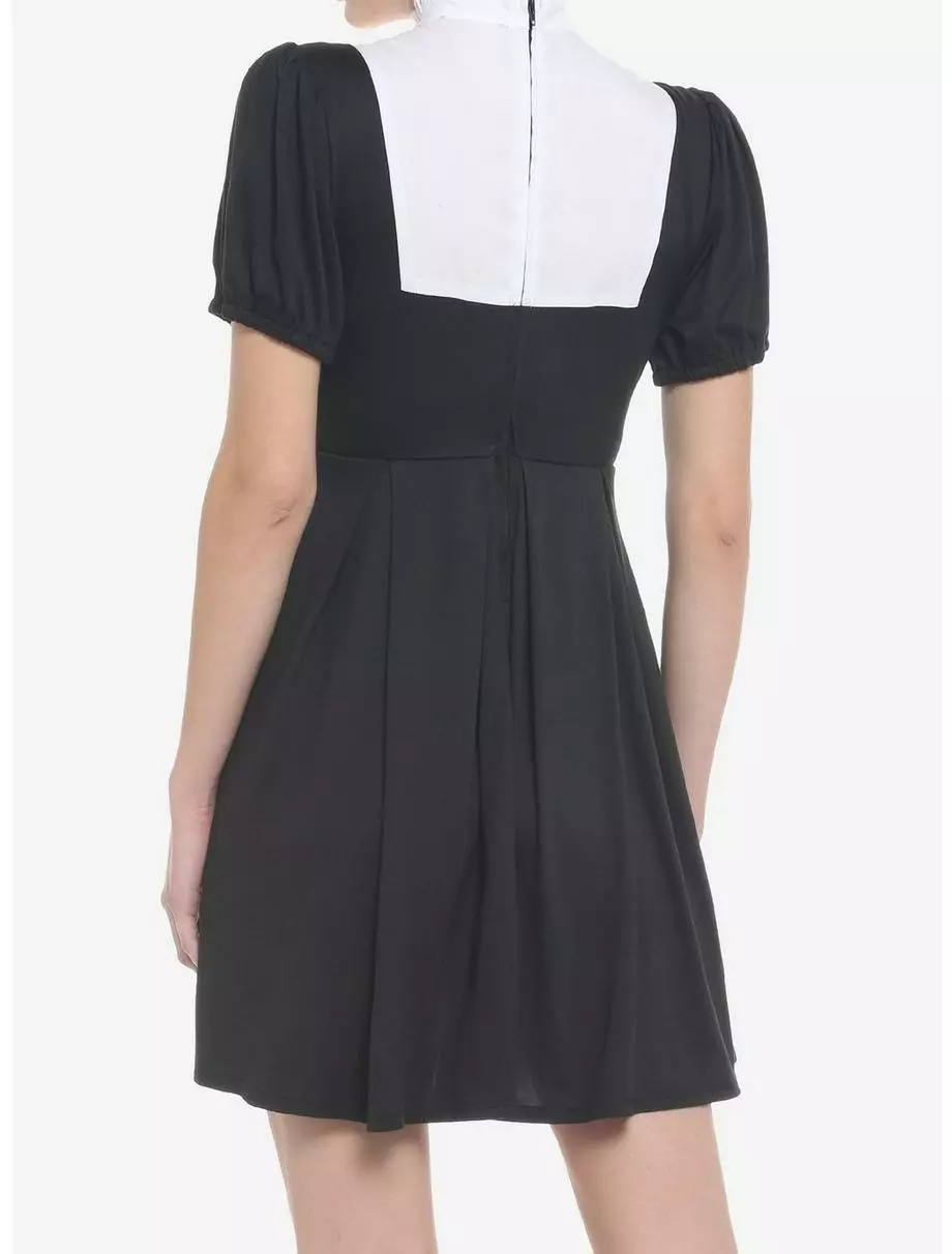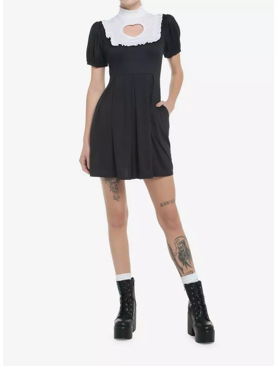Wanna stay on trend while keeping your look proper? This black mini dress has puff sleeves and a white ruffled neckline with a high neck and heart-shaped cutout. There are also pockets.