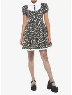 Throw it back with this retro-style little black dress! It has a halter neckline detailed with black-and-white striped fabric and lace, plus heart-shaped buttons down the front bust and just the right amount of stretch.