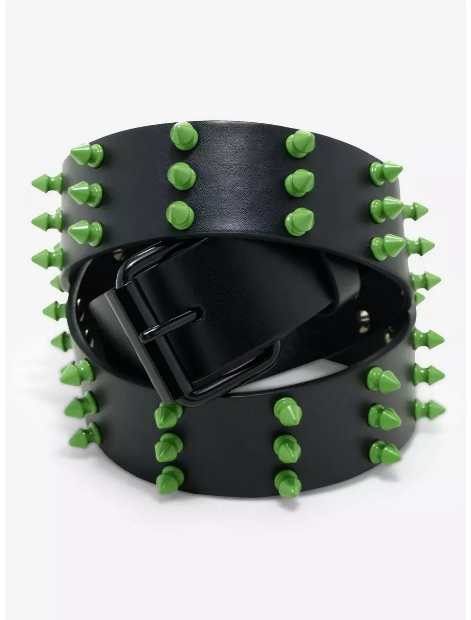 Add a pop of green to your look with this faux leather belt featuring three rows of green spike studs.