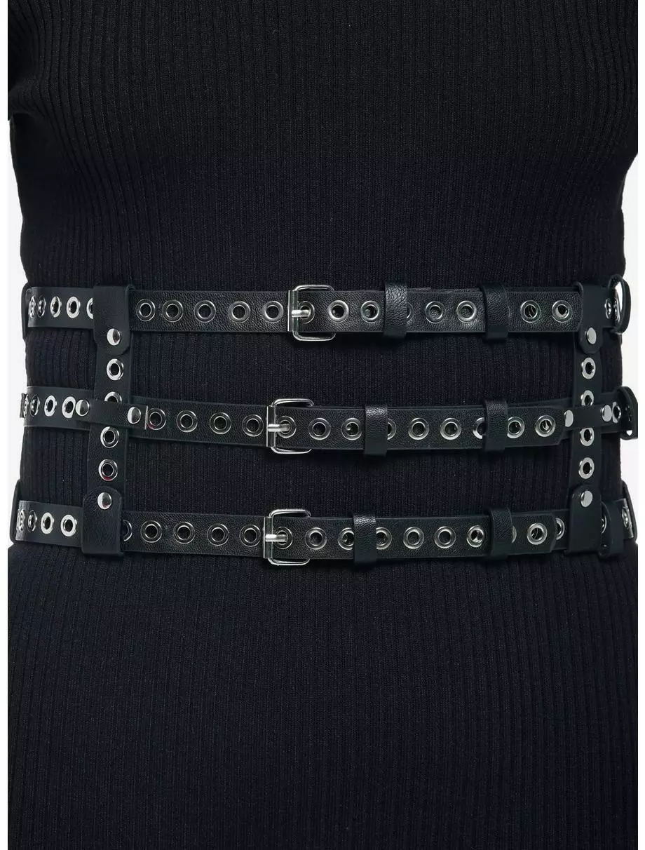 Spice up your OOTD with this fierce corset. This faux leather corset features a triple strap design with silver-tone grommet detailing throughout. Complete with buckle closures.